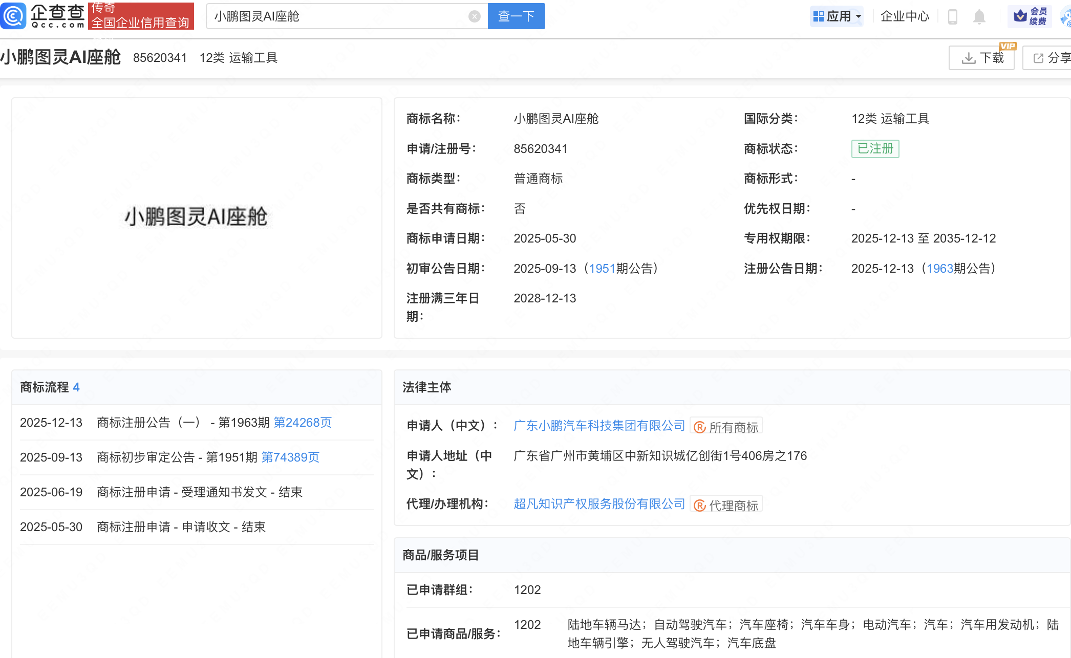 近日,广东小鹏汽车科技集团有限公司成功注册1枚“小鹏图灵AI座舱”商标亿米网,国际分类为运输工具,已申请商品/服务包括:陆地车辆马达、自动驾驶汽车、无人驾驶汽车等。