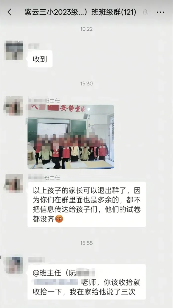 近日,有网友在社交平台发布一张班级微信群聊天截图称谷锦网,贵州省安顺市紫云自治县第三小学某班级班主任,在班级微信群晒出10多名未交齐试卷的学生照片后,继而以文字表述称“以上孩子的家长可以退出群了,因为你们在群里面也是多余的,都不把信息传达给孩子们谷锦网,他们的试卷都没齐”。此事引发关注。